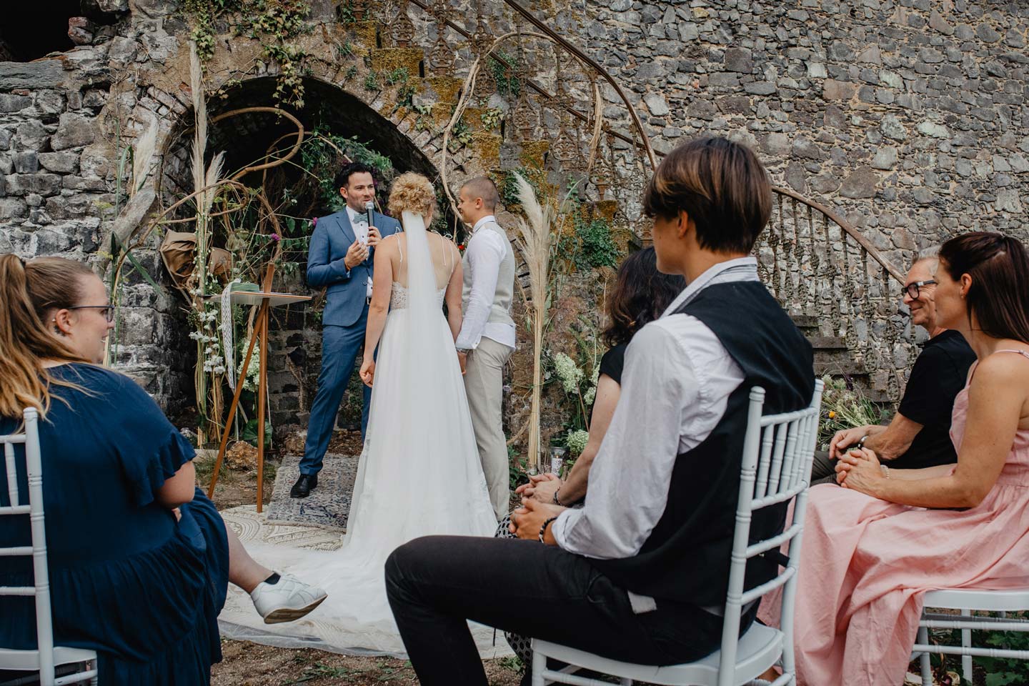 Eva und Tim haben sich eine Märchenhochzeit auf einem Schloss gewünscht, aber nicht im Prinzessinnenstil wie in einem Disneytraum. Nein, es sollte eher verträumt und viel mehr vintage sein. Mit Wildblumen und warmen Farben, passend zum Jahreszeitenwechsel von Sommer auf Herbst. Locker sollte es sein, aber nicht weniger feierlich. Dafür eignet sich das Schloss Schaumburg ganz wunderbar, mit seinen vielen verwachsenen Außenmauern und den verträumten Ecken, egal wo man hinsieht. Die zahlreichen alten Zimmer, die zum Träumen einladen und sich fühlen lassen, wie eine echte Gräfin oder natürlich Graf 😉