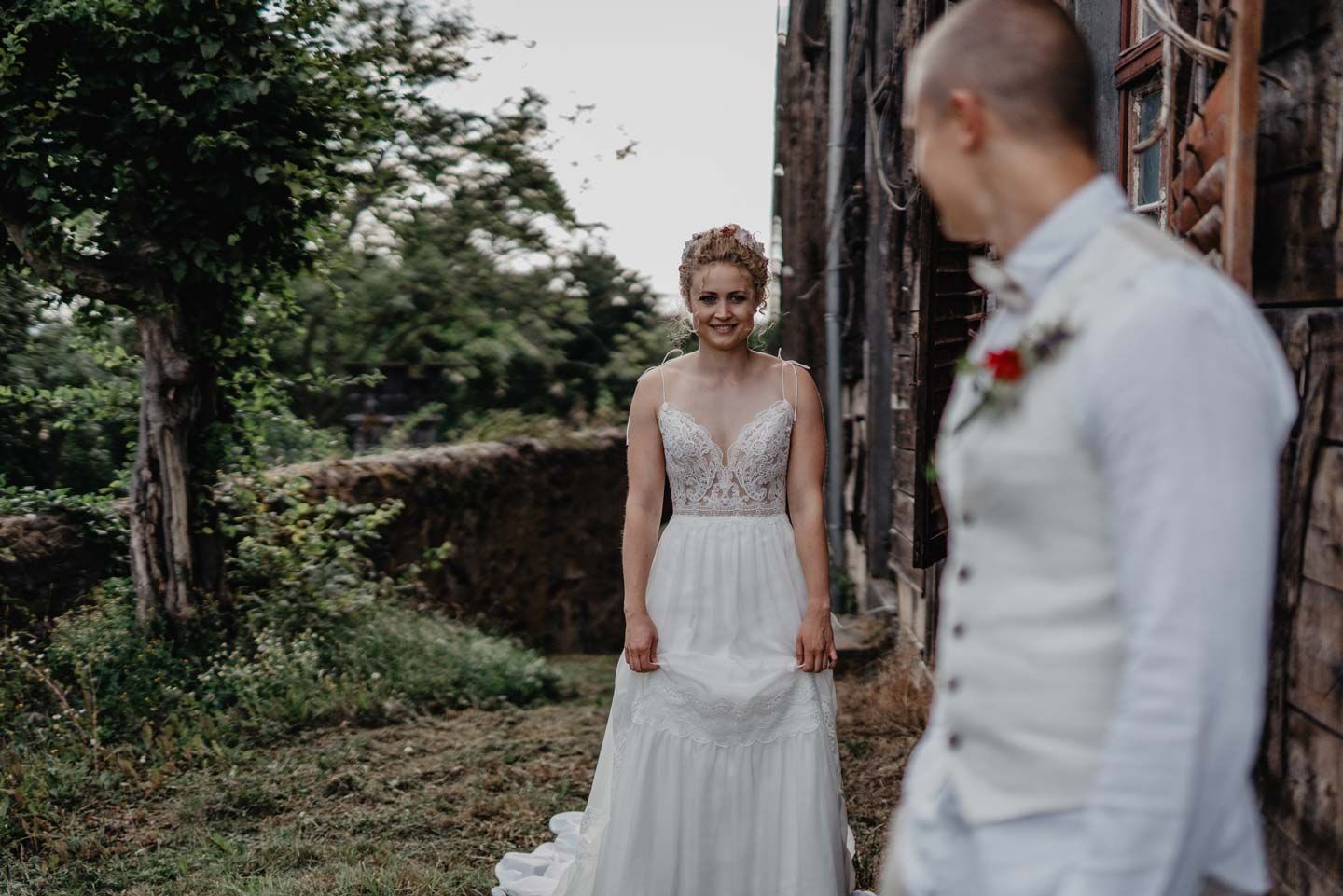 Passend zu der „Nicht-Märchen-Prinzessin“ sollte es ein leichtes Kleid werden für Eva und eine locker gesteckte Frisur mit schönen Blüten. Tim wollte ebenfalls nicht den klassischen Anzug für seine Hochzeit und entschied sich für eine leichte Leinenkombination.