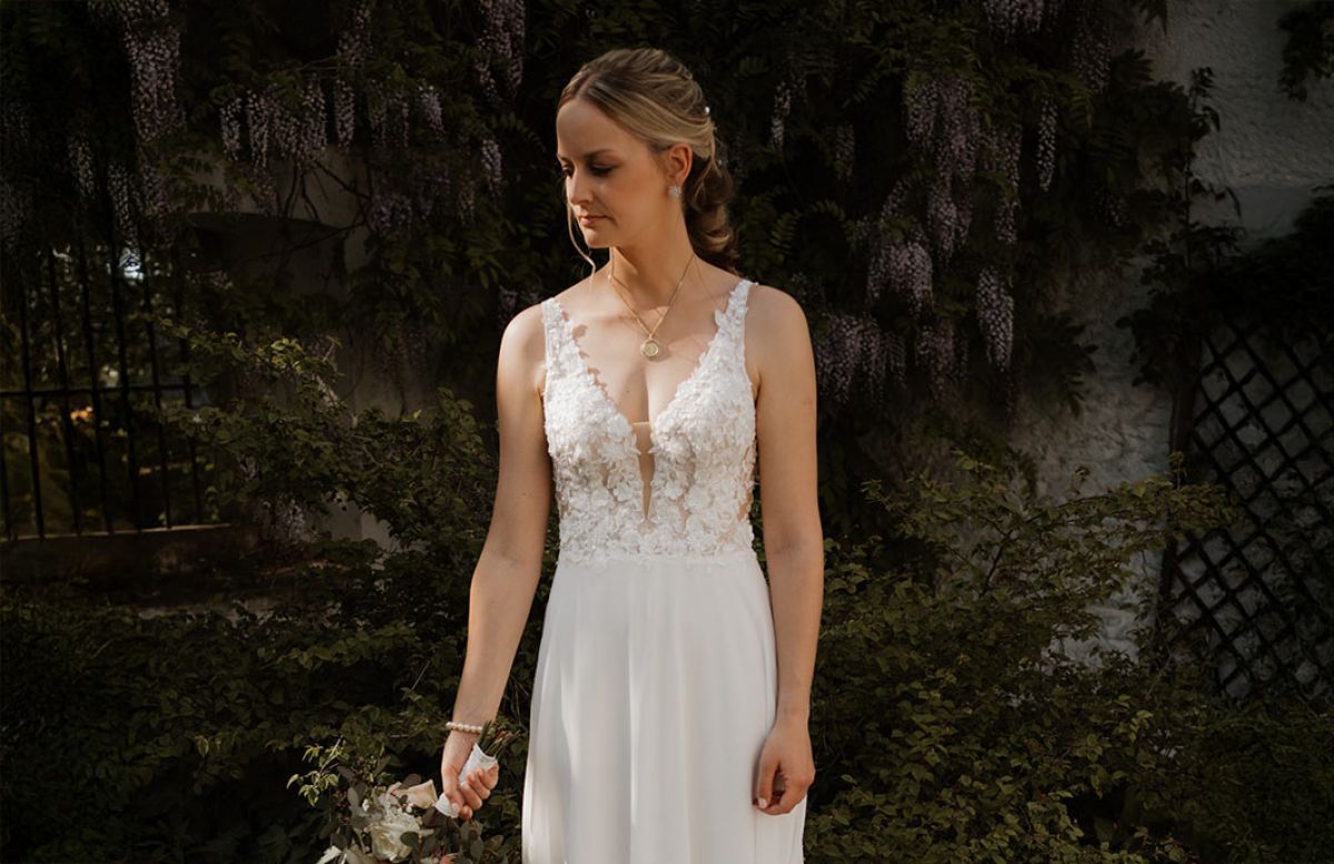 Als ich es anzog, wusste ich sofort: Das ist es. Ärmellos, mit einem tiefen V-Ausschnitt, einem feinen, transparenten Einsatz und dieser wunderschönen floralen Spitze. Der fließende Stoff bewegte sich so leicht, dass ich mich schon in Gedanken durch den Schlosspark tanzen sah.