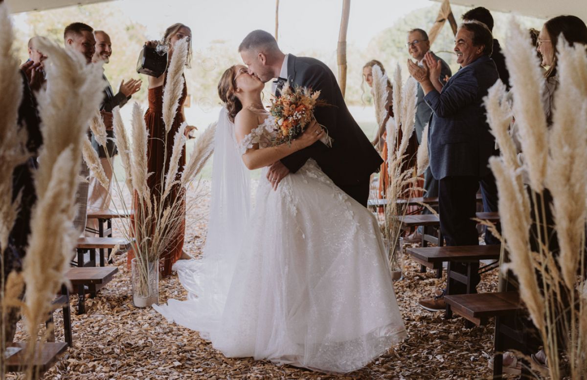 Ein ganz persönlicher Höhepunkt war unser Auszug nach der Trauung: In der Mitte des Gangs haben wir spontan angehalten und uns geküsst – ein kurzer Moment, ganz für uns. Und dabei sind wunderschöne Fotos entstanden, die wir für immer lieben werden.